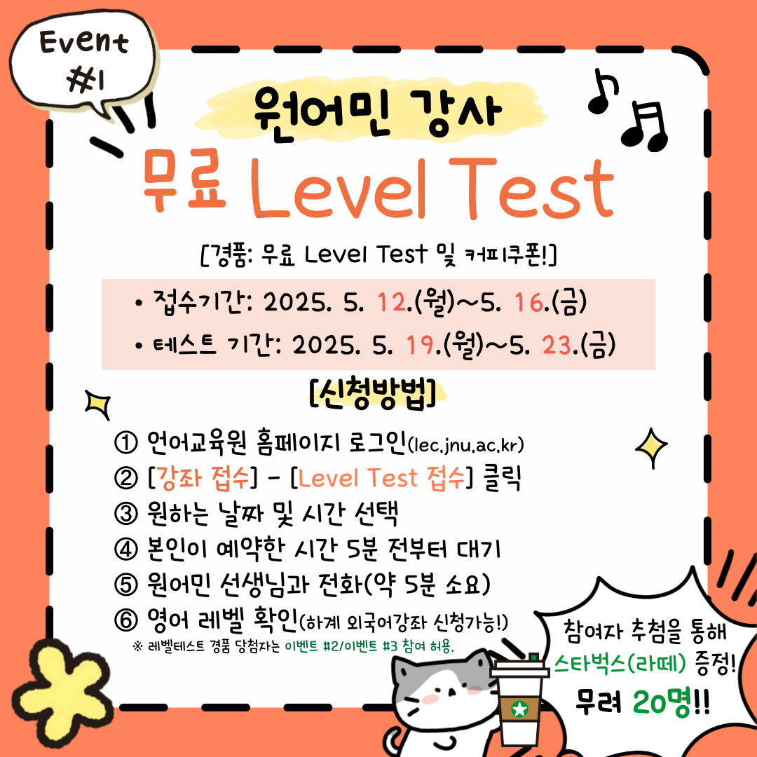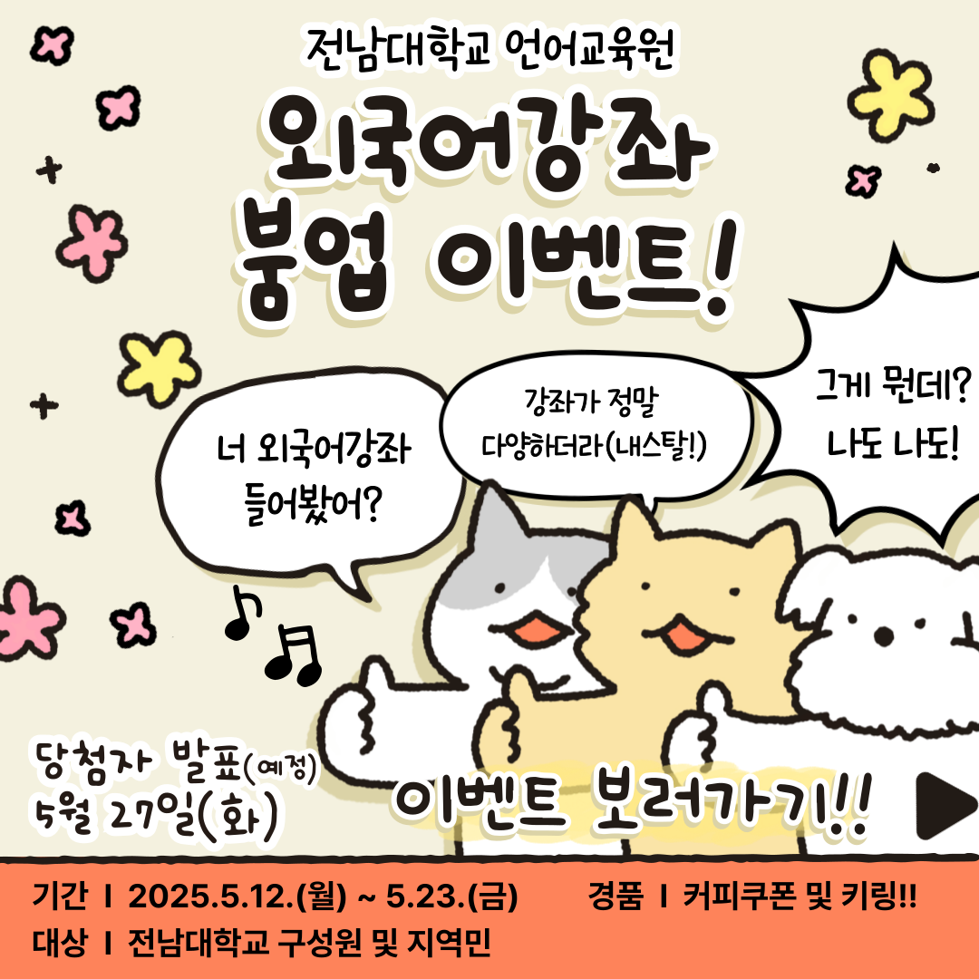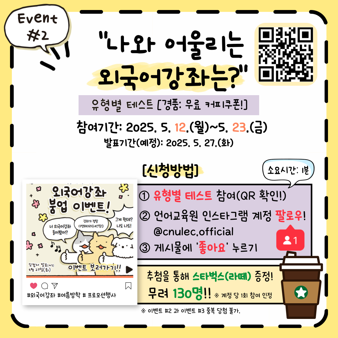 우리 대학 구성원 및 지역민의 영어학습 의욕을 고취하고, 2025년 하계 외국어강좌를 홍보하기 위해 다음과 같이 프로모션(영어학습 붐업) 이벤트를 진행하고자 합니다.
