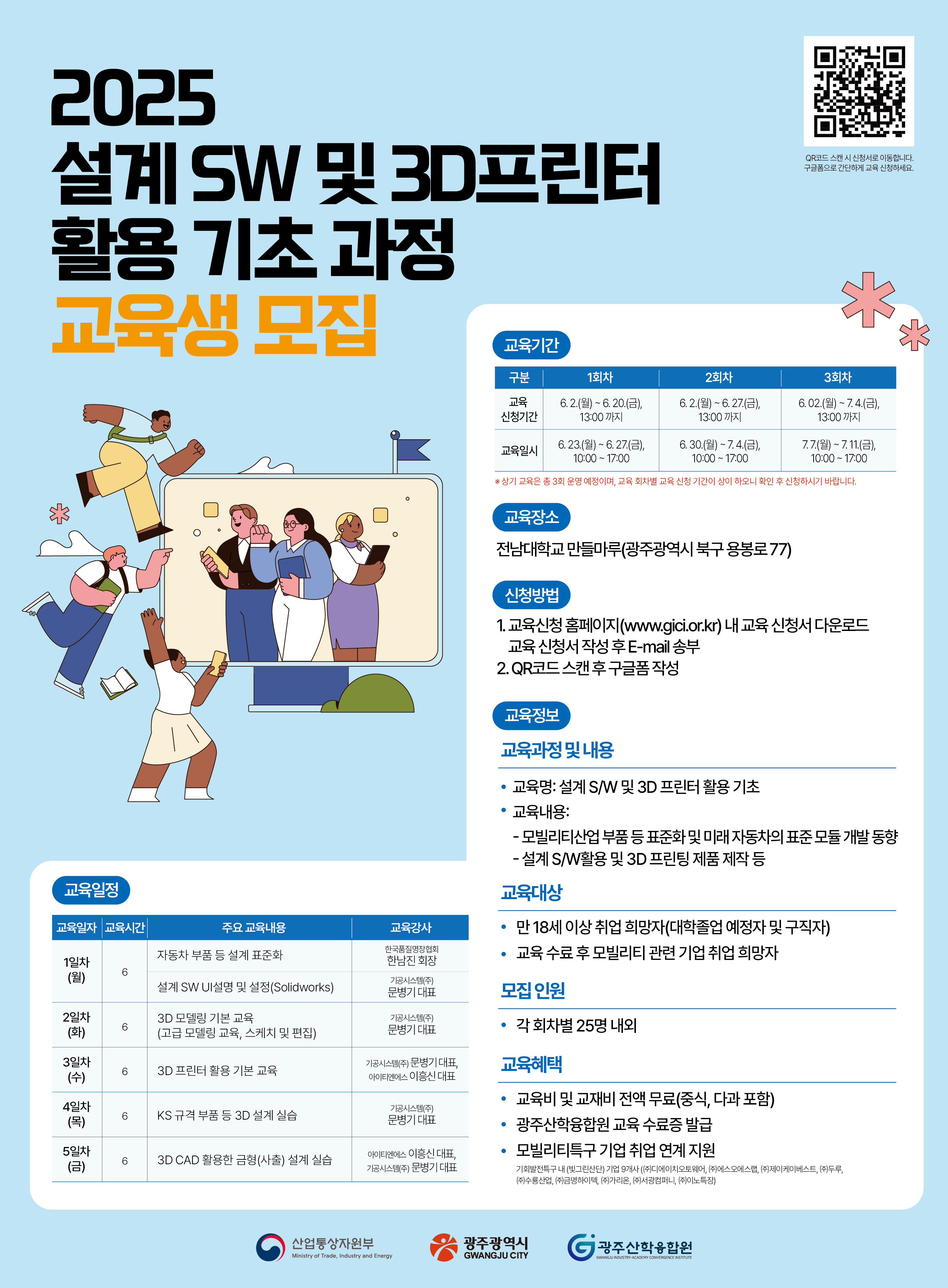 2025년 설계 SW 및 3D프린터 활용 기초 과정 교육생을 다음과 같이 모집하오니, 관심있는 구성원의 많은 참여 바랍니다.