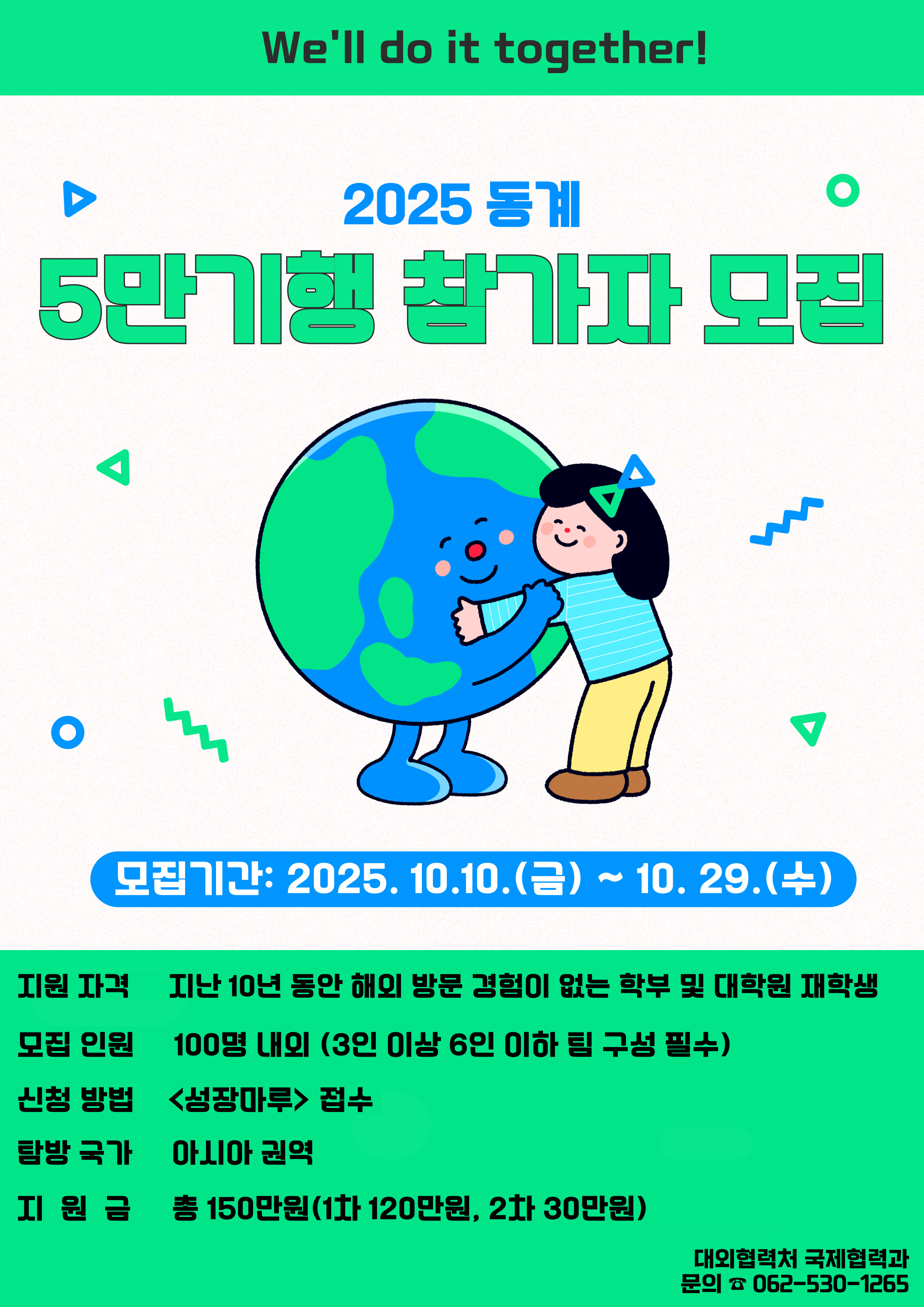 최근 10년간 해외 방문 경험이 없는 학부 및 대학원 학생을 대상으로 체험 및 탐방 학습의 기회를 제공하여 글로컬 우수 인재로 성장할 수 있도록 2025학년도 동계 5만기행 프로그램 운영합니다. 많은 학생들의 참여 바랍니다.
