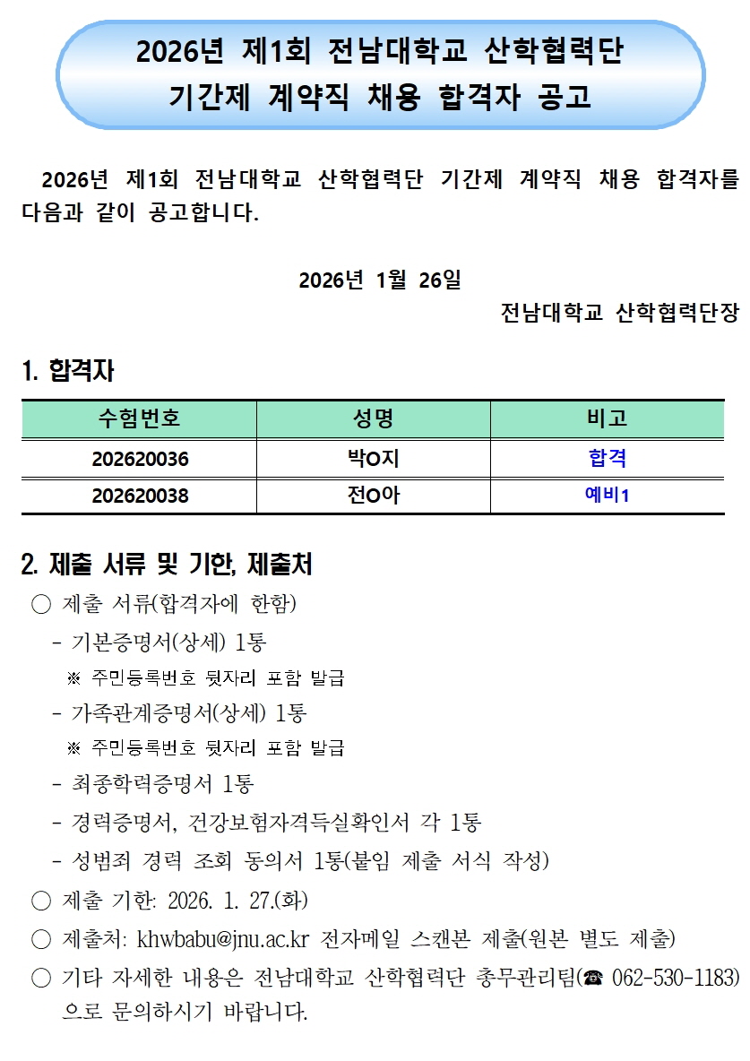 2026년 제1회 전남대학교 산학협력단 기간제 계약직 채용 합격자 공고