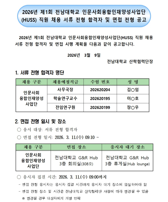 2026년 제1회 전남대학교 인문사회융합인재양성사업단(HUSS) 직원 채용 서류전형 합격자 및 면접전형 공고
